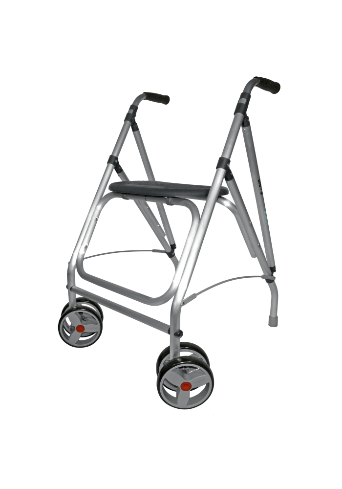 Andador plegable de aluminio ligero, con tacos o con kit de ruedas traseras con frenos por presion. Con asiento incorporado