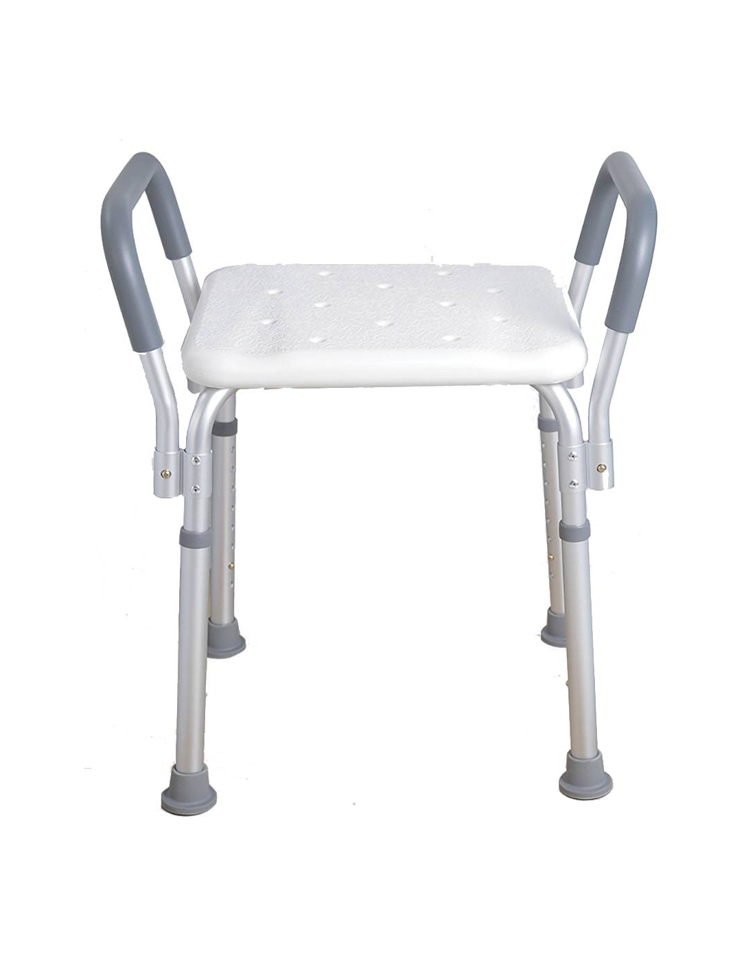 Silla de ducha de plástico con agujeros regulable en altura, con apoyabrazos acolchados. Las patas tienen conteras de goma para evitar deslizamientos