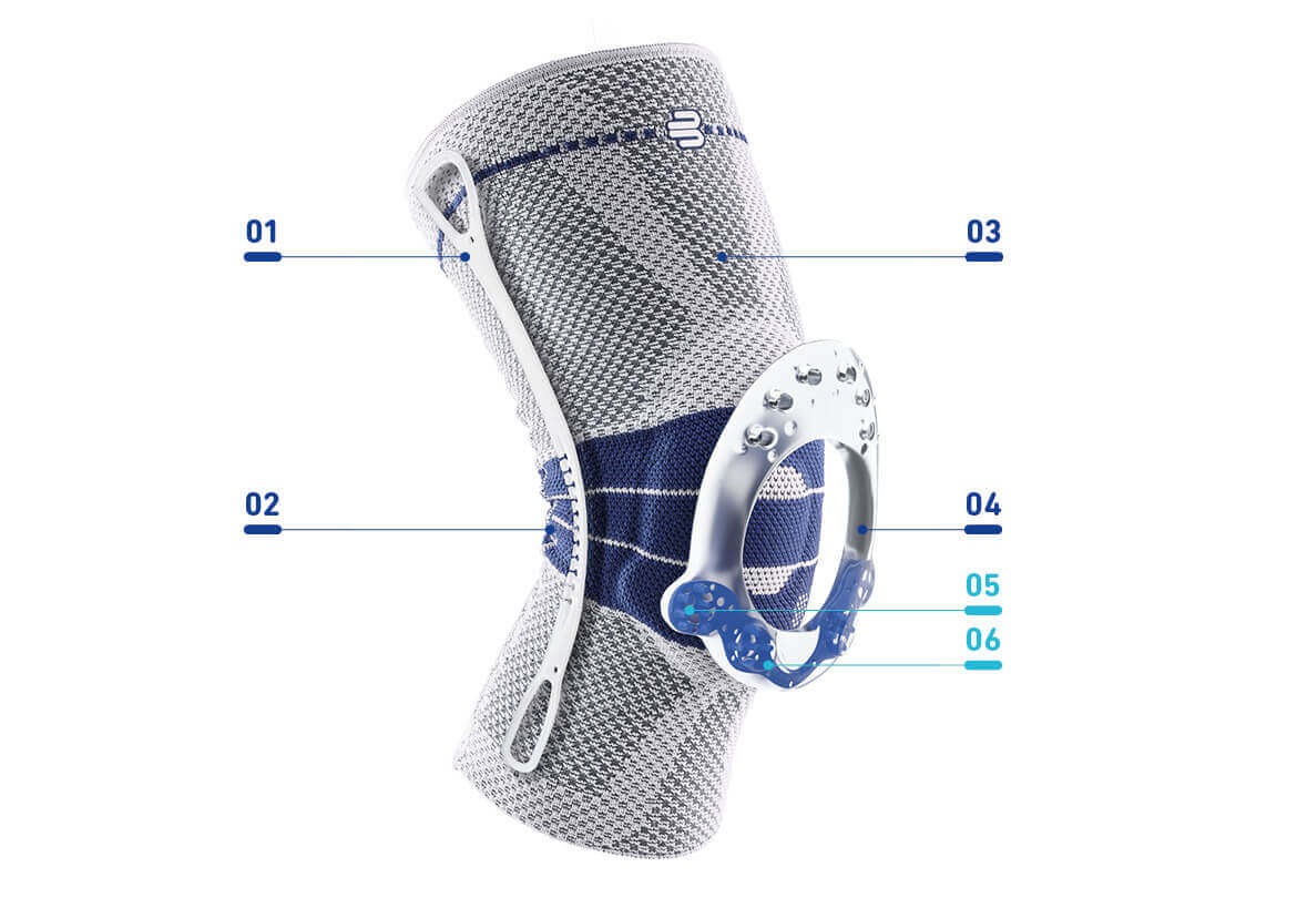La almohadilla funcional en forma de anillo, Omega+ Pad, mantiene la rótula en su lugar y reduce edemas e hinchazones. Los puntos de masaje integrados con sus puntos de presión móviles actúan específicamente en las zonas más dolorosas. Dos varillas de plástico flexibles en los lados garantizan que el GenuTrain siempre se ajuste perfectamente. Las asas integradas en la parte superior e inferior facilitan la colocación y la retirada del vendaje.